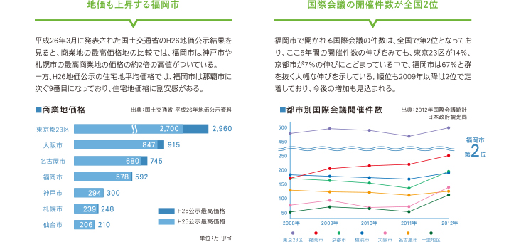 福岡市の成長を裏付けるデータとしては、「人口の増加」「国際会議件数全国2位」「ビジネスホテル稼働率の上昇」「地上昇」などが挙げられます。